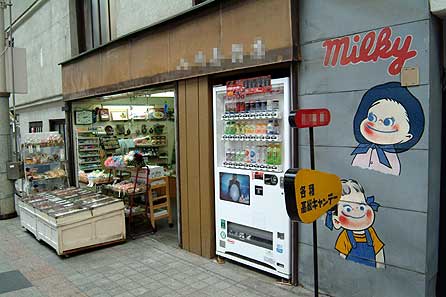 長野の繁華街にある老舗の飴屋さん。永〜い年月を経てなお輝きを放つペコちゃん、ポコちゃんはコレクターなら壁を切り取ってでも手に入れたいところか。