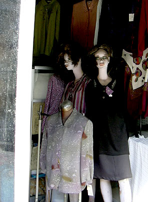 下町のとある洋品店。差し込む日射しによる下からのライティングがかなりコワイけどわたしたちまだまだ現役。